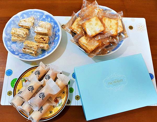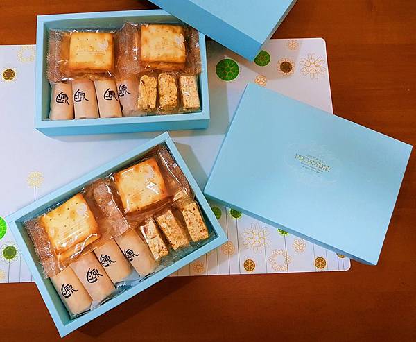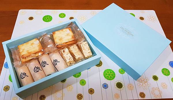 外盒用淺藍色的設計, 非常的高雅, 裡面放了3種小點心 ~