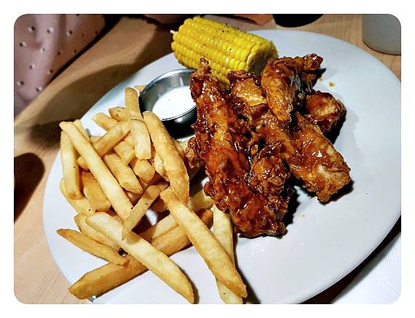 這個炸雞柳條, 外層沾有密汁, 挺好吃的, 而且炸的很酥 附 corn & chips ! 美式風